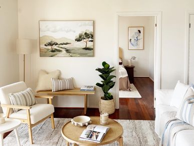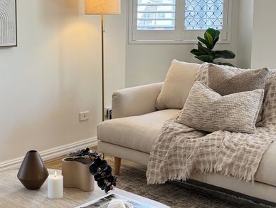 We styled this bright two-bedroom apartment in Five Dock with a focus on simplicity and flow. The layout was enhanced with soft, neutral tones and contemporary pieces that highlighted the apartment’s natural light and open-plan living.